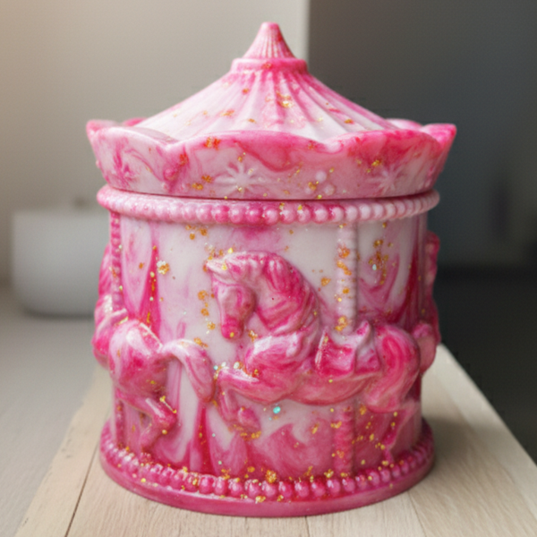 Die Vintage Dose Belle ist ein wundervolles Stück, das zeitlose Kindheitserinnerungen wachruft. Ihre einzigartige Karussellform verleiht ihr einen nostalgischen Charme, der an vergangene Zeiten erinnert. Hergestellt aus hochwertigem Epoxidharz, bietet diese kleine Dose eine robuste Struktur sowie eine glänzende, glatte Oberfläche.