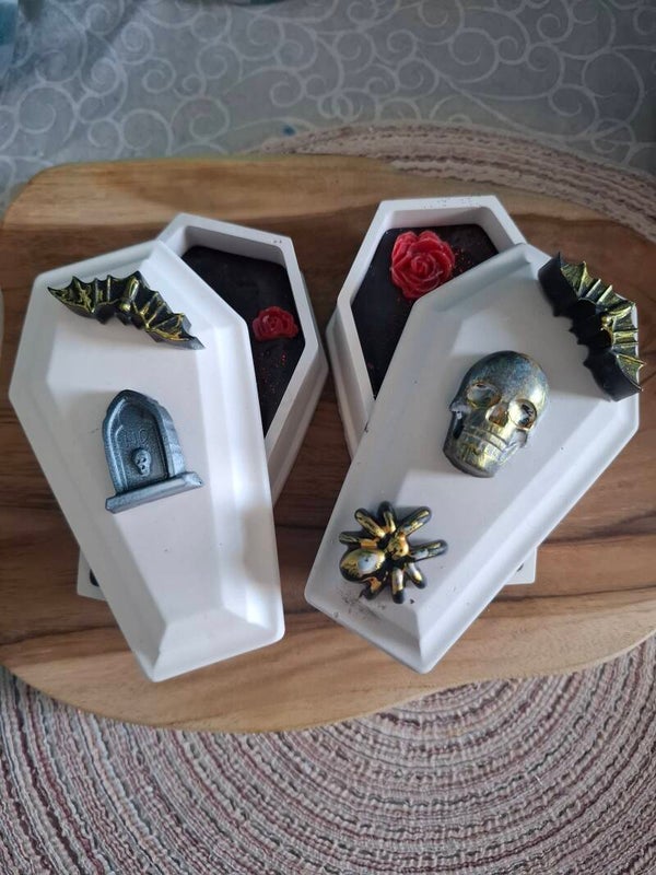 Dark Love Sarg-Kerze Diese einzigartige Duftkerze verbindet dunkle Ästhetik mit warmer, einladender Wärme. Der Sarg besteht aus hochwertigem Keramikguss und wird sorgfältig von Hand gegossen. Er beherbergt ein reiches Soy-Wachs-Füllvolumen von mindestens 200 ml, das langsam und gleichmäßig brennt, für eine lange Duftstrecke.