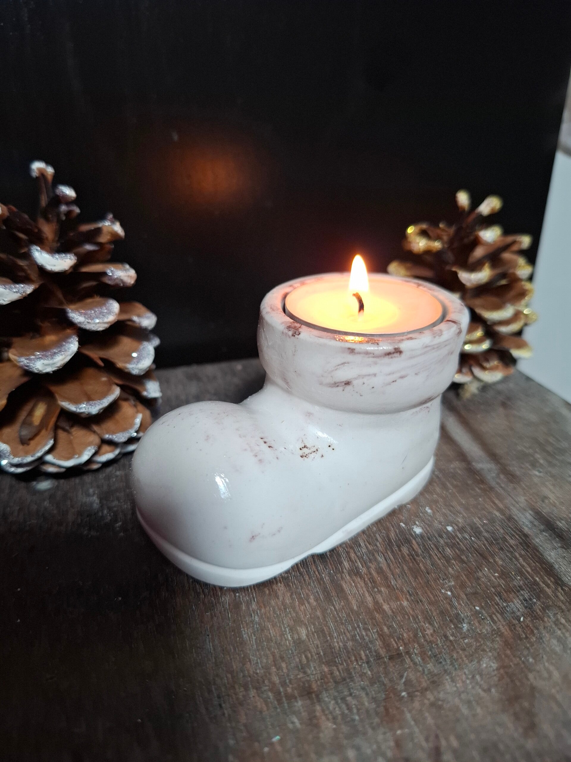 Niedlicher Nikolaussteifel Teelichhalter aus Resin oder Gießpulver – handgemacht, mit funkelndem Glitzer und sanfter Farbstellung. ideal als kleines Geschenk zu Nikolaus.“