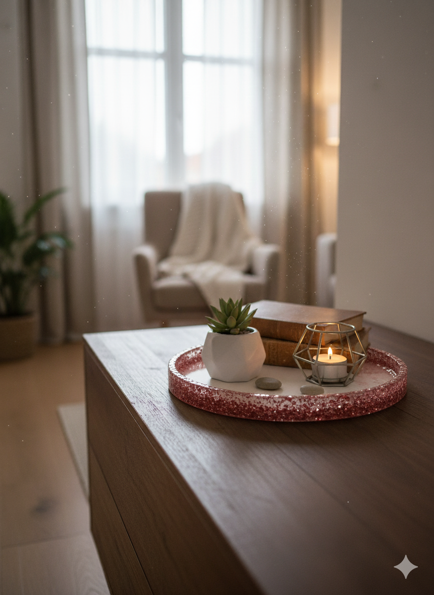 Variante Resin (Individuell & Glitzernd): Gefertigt aus Kunstharz (Resin), bietet diese Version faszinierende Marmor- oder Glitzereffekte (z.B. Rosé-Weiß mit kupferfarbenen Flocken), die jedes Tablett einzigartig machen.