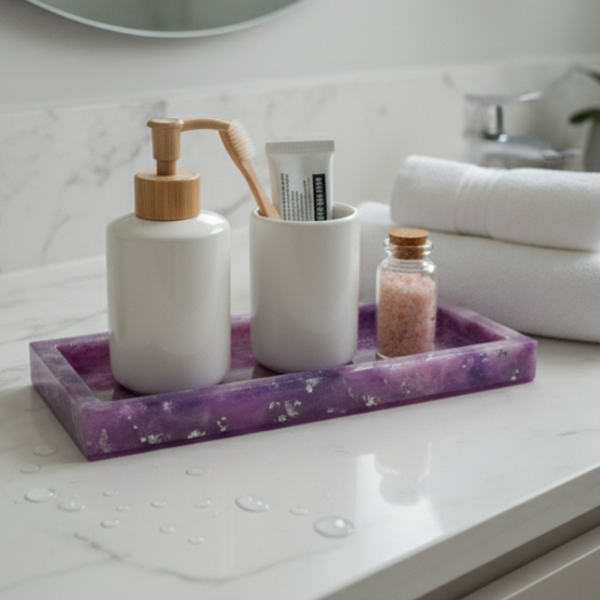 Ob als stilvolle Unterlage im Badezimmer für Seifen, Parfüm und Kosmetik, als elegantes Ablage-Tablett für Schmuck und Schlüssel im Flur oder als edle Deko-Basis für Kerzen und kleine Vasen – dieses Tablett setzt überall zeitlose Akzente. Die klare, rechteckige Form sorgt für eine aufgeräumte und elegante Optik.